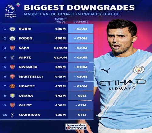 福登 -2000万:25岁、英格兰本土+创造端核心,位置稀缺且多面手属性突出;与罗德里同幅度下调偏严。